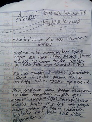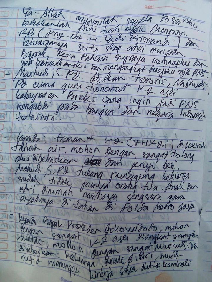 "Berikut adalah tulisan tangan Mashudi, guru honorer asal Brebes yang ditahan Polda Metro Jaya sejak hari Kamis yang lalu gara-gara SMS yang dikirimkannya Kepada Menpan RB Yudy. Ia mengabdi sebagai guru selama 16 tahun, dengan gaji tertinggi di 2016 adalah 350 ribu. Tulisan ini ditulis dari dalam tahanan Polda Metro Jaya.”yang opsekolah.com kutip dari akun facebook Kahar S. Cahyono.